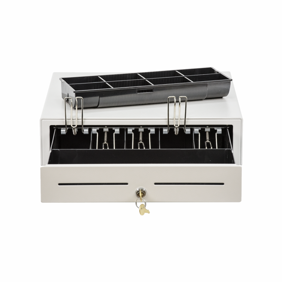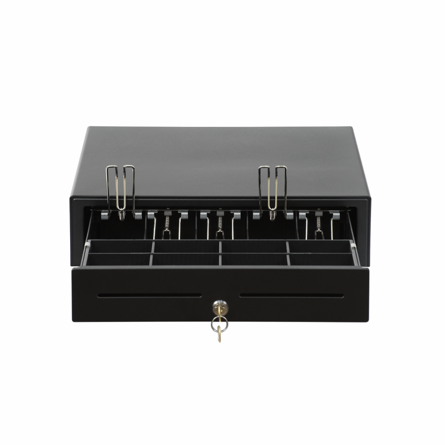 Корпус АТОЛ CD-410 выполнен из металла. В денежном ящике 5 отделений для купюр, 8 ячеек для монет и большое отделение для хранения чеков и счетов. Конструкция денежного ящика позволяет менять ширину отделений для купюр, а отделение для монет может выниматься из денежного ящика. Стальные зажимы для купюр долговечны и надежно фиксируют банкноты.